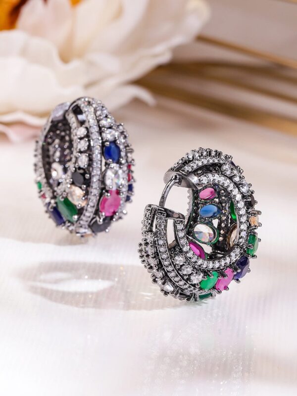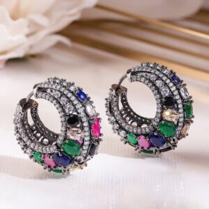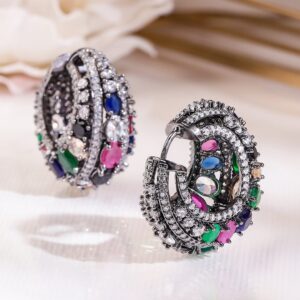 Earrings : These black-toned statement hoop earrings feature multicolor gemstones in emerald green, ruby pink, and sapphire blue, embellished with shimmering white cubic zirconia stones. Designed for women, ideal for parties and special occasions. Occasion : Bring your style to a whole new level with this handcrafted piece of jewellery. When you’re celebrating a special Occasion : – a birthday, wedding, or personal milestone – this piece adds that extra something that makes us feel special and looking our best. Material : & Care Dimension : Length : 3.5 cm, Width: 2.1 cm Net Quantity : 1 Pair Of Earrings Material : Brass Collection : AD and Cubic Zirconia Care Label : It is advisable to avoid contact with water and organic chemicals i.e. perfume sprays. Store jewellery in airtight box. After use, wipe the jewellery with soft cotton cloth.