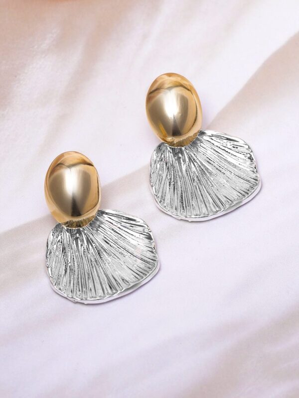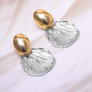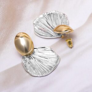 Earrings : These stunning dual-tone earrings feature an elegant combination of gold-plated tops and silver-plated textured shell drops. The unique design captures the beauty of natural elements, making these earrings a perfect blend of sophistication and contemporary style. Ideal for adding a touch of elegance to any outfit, these earrings are crafted to make a statement. Lightweight and versatile, they are perfect for both casual and formal occasions, ensuring you stand out with their distinctive look. Occasion : Bring your style to a whole new level with this handcrafted piece of jewellery. When you’re celebrating a special Occasion : – a birthday, wedding, or personal milestone – this piece adds that extra something that makes us feel special and looking our best. Material : & Care Dimension : Size : Length : 4 cm, Width : 3 cm Material :Brass Weight : 16.71g Net Qnty : 1 Pair Earrings Care Label : It is advisable to avoid contact with water and organic chemicals i.e. perfume sprays. Store jewellery in airtight box. After use, wipe the jewellery with soft cotton cloth.