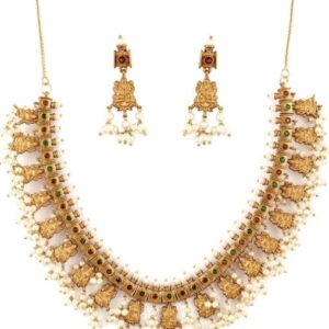 It’s a jewellery set fit for the queens! Exude the royal vibe with this stone studded jewellery set. Consisting of a necklace, matching earrings, this necklace set is crafted from gold-plated brass, stones and beads. Occasion : Bring your style to a whole new level with this handcrafted piece of jewellery. When you’re celebrating a special Occasion : – a birthday, wedding, or personal milestone – this piece adds that extra something that makes us feel special and looking our best. Material : & Care¬† Dimension : Necklace 18 cm; Earrings 6 cm Material : ¬†Copper Care Label : It is advisable to avoid contact with water and organic chemicals i.e. perfume sprays. Store jewellery in airtight box. After use, wipe the jewellery with soft cotton cloth