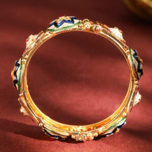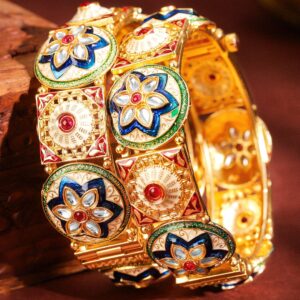 Elevate your traditional ensemble with these stunning gold-plated bangles featuring intricate floral designs adorned with vibrant enamel detailing and shimmering kundan stones. The multicolor accents in red, green, and blue create a regal look, making these bangles ideal for weddings, festive occasions, or cultural celebrations. Crafted with premium quality materials, these bangles ensure durability and comfort, adding timeless elegance to your jewelry collection. Occasion : Bring your style to a whole new level with this handcrafted piece of jewellery. When you’re celebrating a special Occasion : – a birthday, wedding, or personal milestone – this piece adds that extra something that makes us feel special and looking our best. Material : & Care Material: Brass Net Weight: 93 Gram Net Quantity: Set Of Two Bangles Care Label: It is advisable to avoid contact with water and organic chemicals i.e. perfume sprays. Store jewellery in airtight box. After use, wipe the jewellery with soft cotton cloth.