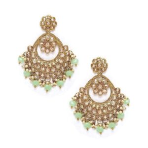 Chandbali Earrings One of the most versatile forms of ornate designs that goes well with every style and personality. Wear one of these and you don‚Äôt have to worry about any other accessory. Occasion : Bring your style to a whole new level with this handcrafted piece of jewellery. When you’re celebrating a special Occasion : – a birthday, wedding, or personal milestone – this piece adds that extra something that makes us feel special and looking our best. Material : & Care Dimension : Length 8 cm Material : Brass brass Plating Gold Toned Stone ¬†Kundan Studded Pastel Green Color Beads Embellished Care Label : It is advisable to avoid contact with water and organic chemicals i.e. perfume sprays. Store jewellery in airtight box. After use, wipe the jewellery with soft cotton cloth.