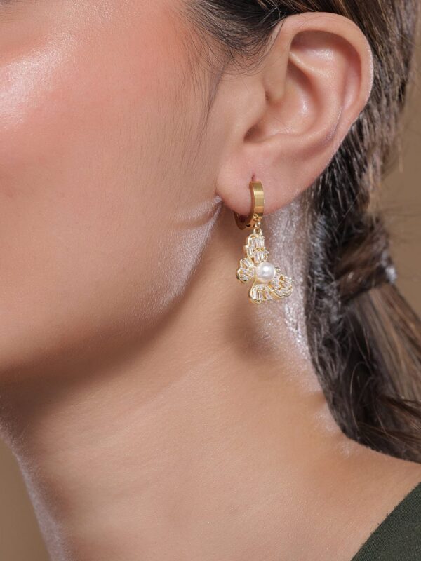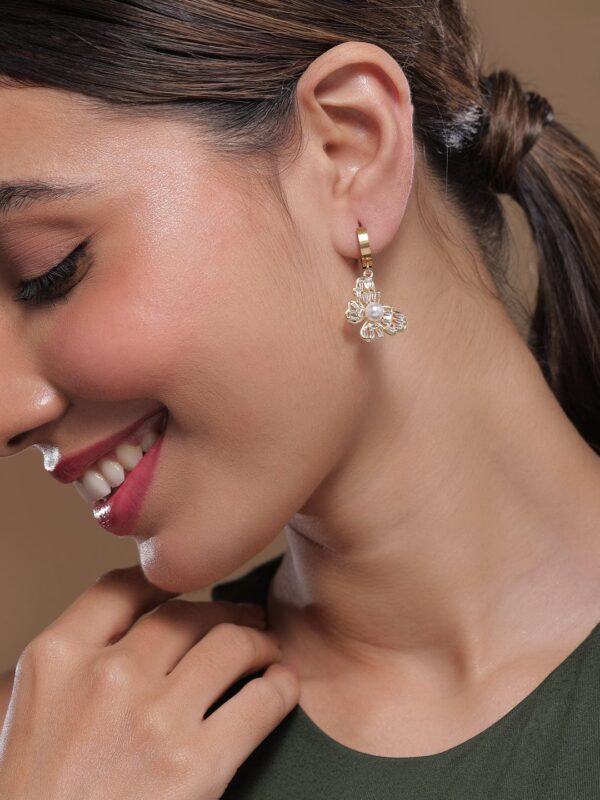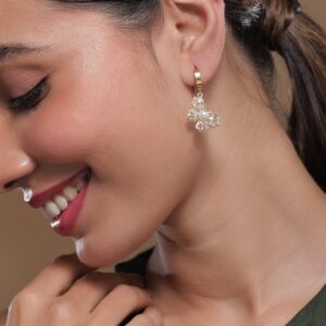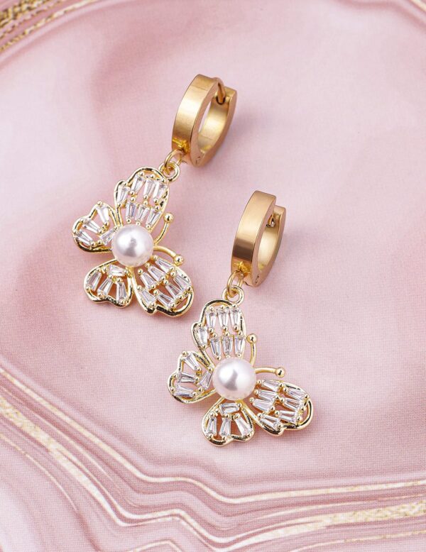 Earrings : 18K gold-plated stainless steel butterfly drop earrings featuring a central pearl stud and sparkling cubic zirconia accents. Tarnish-free and waterproof, these elegant earrings offer a blend of classic charm and modern sophistication. Occasion : Bring your style to a whole new level with this handcrafted piece of jewellery. When you’re celebrating a special Occasion : – a birthday, wedding, or personal milestone – this piece adds that extra something that makes us feel special and looking our best. Material : & Care Dimension : Size : Length : 3.5 cm, Width : 1.5 cm Material :Stainless steel Care Label : It is advisable to avoid contact with water and organic chemicals i.e. perfume sprays. Store jewellery in airtight box. After use, wipe the jewellery with soft cotton cloth.