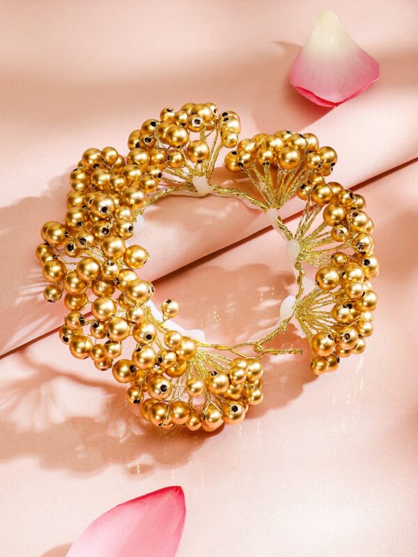 Elevate your hairstyle with this exquisite gold-toned handcrafted hair bun accessory, intricately adorned with golden pearl beads for a luxurious and regal touch. The elegant floral-inspired structure adds volume and charm, making it a perfect choice for weddings, festive occasions, and traditional celebrations. A timeless addition to your accessory collection. Occasion : Bring your style to a whole new level with this handcrafted piece of jewellery. When you’re celebrating a special Occasion : – a birthday, wedding, festive or personal milestone – this piece adds that extra something that makes us feel special and looking our best. Material & Care Dimension : 23 cm Material : Beads Weight : 15g Net Qnty : 1 Hair Bun Care Label : ¬†It is advisable to avoid contact with water and organic chemicals i.e. perfume sprays. Store jewellery in airtight box. After use, wipe the jewellery with soft cotton cloth.