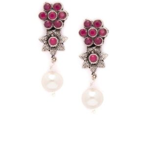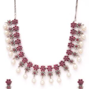 It’s a jewellery set fit for the queens! Exude the royal vibe with this stone studded jewellery set. Consisting of a necklace, matching earrings, this necklace set is crafted fromOxidised Silver Toned Faux Ruby Studded Embellished With Pearls¬† Occasion : Bring your style to a whole new level with this handcrafted piece of jewellery. When you’re celebrating a special Occasion : – a birthday, wedding, or personal milestone – this piece adds that extra something that makes us feel special and looking our best. Material : & Care Dimension : Length Necklace¬†15 cm, Earrings¬†4 cm¬† Material : ¬†Brass Care Label : It is advisable to avoid contact with water and organic chemicals i.e. perfume sprays. Store jewellery in airtight box. After use, wipe the jewellery with soft cotton cloth.