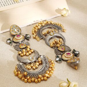 Earrings : These oxidized silver and gold-plated statement long chandbali earrings feature kundan, ruby, emerald accents, and intricate gold bead details, making them a standout, opulent accessory. Material : & Care Dimension : Size : Length : 14 cm, Width : 5 cm Material :Brass Care Label : It is advisable to avoid contact with water and organic chemicals i.e. perfume sprays. Store jewellery in airtight box. After use, wipe the jewellery with soft cotton cloth.