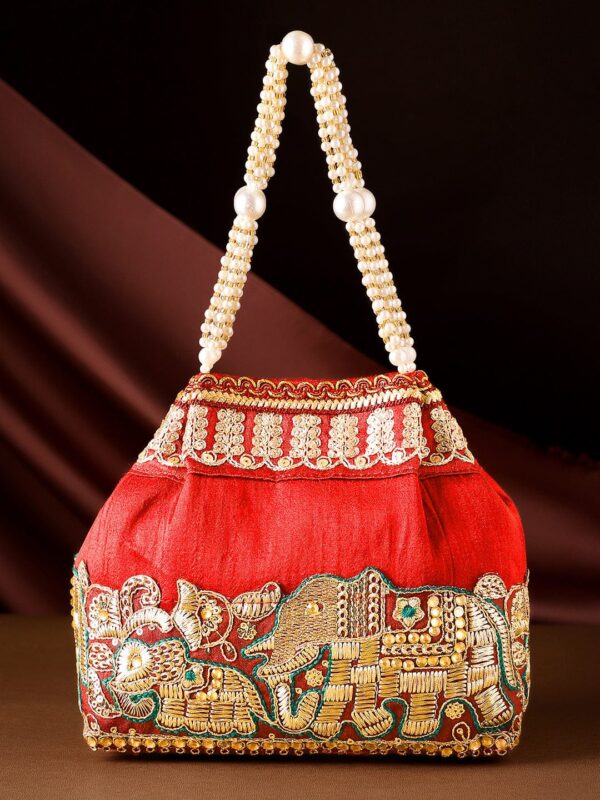 Handbags : Discover the elegance of Red Embroidered & Green Border Potli Bag with Pearl Handle & Elephant Motif Details. This piece combines quality craftsmanship with a timeless design, making it perfect for any occasion. Elevate your style effortlessly and enjoy compliments on your refined taste. A must-have addition to your jewelry collection. Occasion : Bring your style to a whole new level with this handcrafted piece of jewellery. When you’re celebrating a special Occasion : – a birthday, wedding, or personal milestone – this piece adds that extra something that makes us feel special and looking our best. Material : & Care Dimension : Handbags Size :Length : 32 cm Material :Brass Weight : 135.46g Net Qnty : 1 Bag Care Label : It is advisable to avoid contact with water and organic chemicals i.e. perfume sprays. Store jewellery in airtight box. After use, wipe the jewellery with soft cotton cloth.