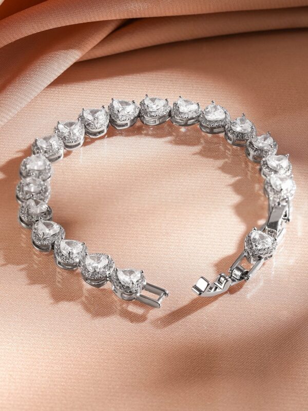 Bracelet : A luxurious rhodium-plated bracelet featuring heart-shaped AAA cubic zirconia stones in a sleek tennis design. Its dazzling brilliance and refined craftsmanship make it a timeless piece. Occasion : Bring your style to a whole new level with this handcrafted piece of jewellery. When you’re celebrating a special Occasion : – a birthday, wedding, or personal milestone – this piece adds that extra something that makes us feel special and looking our best. Material : & Care Dimension : Length : 18.3 cm, Width: 0.7 cm Net Weight: 18.12 g Net Quantity : 1 Bracelet Material :Brass Care Label : It is advisable to avoid contact with water and organic chemicals i.e. perfume sprays. Store jewellery in airtight box. After use, wipe the jewellery with soft cotton cloth.