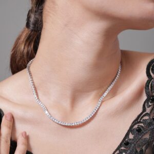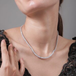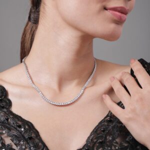 Necklace and Chains : This Rhodium Plated Necklace is a timeless piece, featuring a classic tennis design meticulously studded with sparkling AD & Cubic Zirconia stones. The continuous line of stones creates a refined and elegant look, perfect for adding a touch of sophistication to any outfit. The rhodium plating ensures durability and a lasting shine, making this necklace a versatile addition to your jewelry collection. Ideal for both everyday elegance and special occasions, this necklace is a must-have for anyone who appreciates understated luxury. Occasion : Bring your style to a whole new level with this handcrafted piece of jewellery. When you’re celebrating a special Occasion : – a birthday, wedding, or personal milestone – this piece adds that extra something that makes us feel special and looking our best. Material : & Care Dimension : Size : Length : 16 cm, Width : 0.5 cm Material :Brass Care Label : It is advisable to avoid contact with water and organic chemicals i.e. perfume sprays. Store jewellery in airtight box. After use, wipe the jewellery with soft cotton cloth.