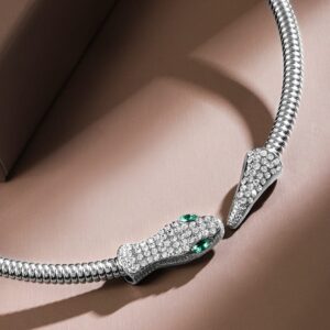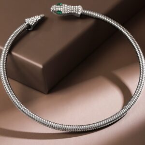 Necklace and Chains : Bold and captivating, this statement choker features a sleek, coiled silver-toned band ending in two intricately detailed serpent heads encrusted with shimmering stones. The piercing emerald-green eyes add a touch of mystique, making this piece a symbol of power, elegance, and timeless allure. Occasion : Bring your style to a whole new level with this handcrafted piece of jewellery. When you’re celebrating a special Occasion : – a birthday, wedding, or personal milestone – this piece adds that extra something that makes us feel special and looking our best. Material : & Care Dimension : Size : Length : 30 cm, Width: 1 cm Net Weight: 50g Net Quantity : 1 Necklace Material : Care Label : It is advisable to avoid contact with water and organic chemicals i.e. perfume sprays. Store jewellery in airtight box. After use, wipe the jewellery with soft cotton cloth.