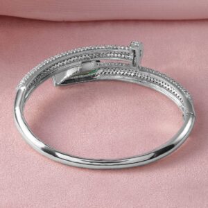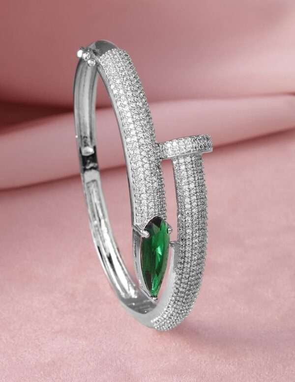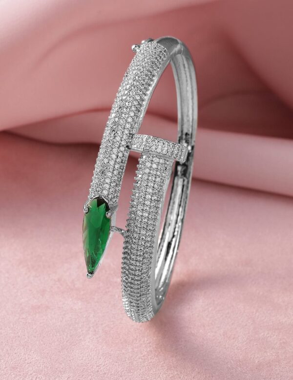 Bracelet : Elevate your style with this exquisite rhodium-plated bangle style bracelet, featuring a stunning marquise-cut emerald centerpiece. The sleek, contemporary design is enhanced by rows of sparkling cubic zirconia, creating a dazzling effect that complements the vibrant green stone. Perfect for adding a touch of elegance to any ensemble, this bracelet is a versatile accessory for both formal and casual occasions. Occasion : Bring your style to a whole new level with this handcrafted piece of jewellery. When you’re celebrating a special Occasion : – a birthday, wedding, or personal milestone – this piece adds that extra something that makes us feel special and looking our best. Material : & Care Dimension : Size : Length : 16 cm, Width : 3 cm Material :Brass Care Label : It is advisable to avoid contact with water and organic chemicals i.e. perfume sprays. Store jewellery in airtight box. After use, wipe the jewellery with soft cotton cloth.