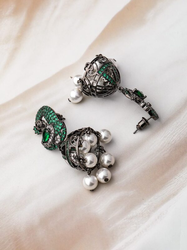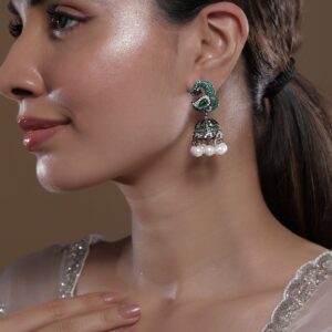 Earrings : These rhodium-plated jhumka earrings feature a captivating peacock design, Studded with emerald green AD and Cubic Zirconia stones. The intricate detailing is enhanced by elegant pearl drops, making these earrings a perfect blend of traditional charm and modern sophistication. Occasion : Bring your style to a whole new level with this handcrafted piece of jewellery. When you’re celebrating a special Occasion : – a birthday, wedding, or personal milestone – this piece adds that extra something that makes us feel special and looking our best. Material : & Care Dimension : Size : Length : 5.5 cm, Width : 2 cm Material :Brass Care Label : It is advisable to avoid contact with water and organic chemicals i.e. perfume sprays. Store jewellery in airtight box. After use, wipe the jewellery with soft cotton cloth.