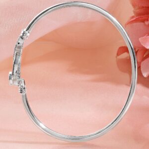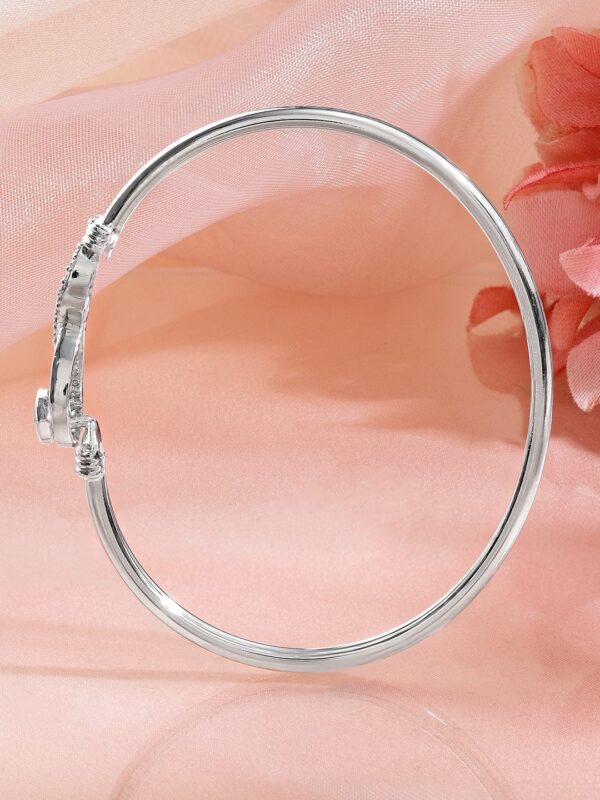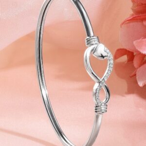 This rhodium-plated bracelet features a modern infinity loop with a polished heart motif and crystal zirconia detailing, offering a minimal yet deeply symbolic expression of eternal love. Occasion : Bring your style to a whole new level with this handcrafted piece of jewellery. When you’re celebrating a special Occasion : – a birthday, daily minimal, festive, party or personal milestone – this piece adds that extra something that makes us feel special and looking our best. Material & Care Dimension : Length: 2.5 cm ; Width: 1 cm Material: Brass Net Weight: 5.25 Gram Net Quantity: 1 Bracelet Care Label: It is advisable to avoid contact with water and organic chemicals i.e. perfume sprays. Store jewellery in airtight box. After use, wipe the jewellery with soft cotton cloth.