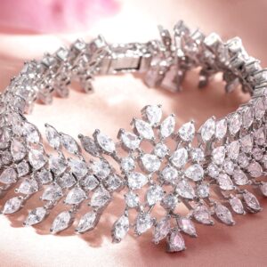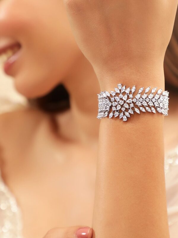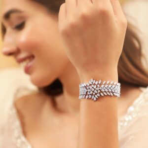 Adorn your wrist with the captivating allure of our Rhodium Plated Marquise and Pear Crystal Zirconia Demi-Fine Luxury Bracelet. Each intricately set marquise and pear-cut crystal zirconia creates a mesmerizing play of light, exuding timeless elegance. The rhodium-plated finish adds a touch of sophistication, making this bracelet a statement piece for any occasion. Elevate your style with this exquisite blend of glamour and grace. Occasion : Bring your style to a whole new level with this handcrafted piece of jewellery. When you’re celebrating a special Occasion : – a birthday, wedding, or personal milestone – this piece adds that extra something that makes us feel special and looking our best. Material : & Care Dimension :Length : Adjustable Material: Brass Net Weight: 25.5 Gram Net Quantity: 1 Bracelet Care Label: It is advisable to avoid contact with water and organic chemicals i.e. perfume sprays. Store jewellery in airtight box. After use, wipe the jewellery with soft cotton cloth.