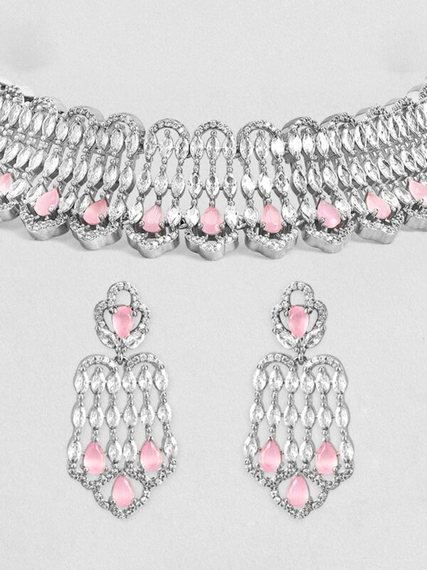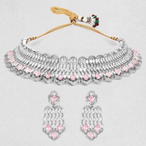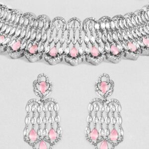 Jewellery Set : Discover the elegance of Rhodium-Plated Pastel Pink AD Stone & Cubic Zirconia Studded Choker Necklace Set. This piece combines quality craftsmanship with a timeless design, making it perfect for any occasion. Elevate your style effortlessly and enjoy compliments on your refined taste. A must-have addition to your jewelry collection. Occasion : Bring your style to a whole new level with this handcrafted piece of jewellery. When you’re celebrating a special Occasion : – a birthday, wedding, or personal milestone – this piece adds that extra something that makes us feel special and looking our best. Material : & Care Dimension : Necklace Size : 18 cm / 2.5 cm, Earrings Size : 4.3 cm / 2 cm Material: Brass Net Weight: 75.48 Gram Net Quantity: 1 Necklace & 1 Pair of Earrings Care Label: It is advisable to avoid contact with water and organic chemicals i.e. perfume sprays. Store jewellery in airtight box. After use, wipe the jewellery with soft cotton cloth.