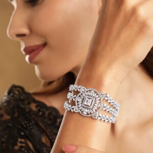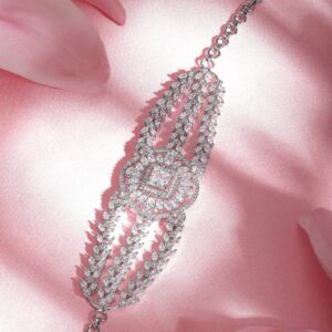This exquisite piece features intricately crafted layers adorned with sparkling pave zirconia stones on a rhodium-plated chain, creating a stunning and versatile accessory. Elevate your style with the brilliance of this tri-layered bracelet, perfect for adding a touch of glamour and sophistication to any ensemble. Embrace the allure of contemporary design with this eye-catching piece. Occasion : Bring your style to a whole new level with this handcrafted piece of jewellery. When you’re celebrating a special Occasion : – a birthday, wedding, or personal milestone – this piece adds that extra something that makes us feel special and looking our best. Material & Care Dimension : Length 22 cm Material: Brass Net Weight: 32.01 Gram Net Quantity: 1 Bracelet Care Label: It is advisable to avoid contact with water and organic chemicals i.e. perfume sprays. Store jewellery in airtight box. After use, wipe the jewellery with soft cotton cloth.