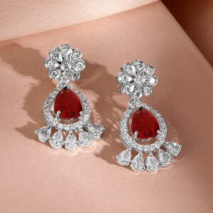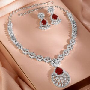 Jewellery Set : This rhodium-plated necklace set features radiant ruby red AD stones and sparkling cubic zirconia, paired with matching earrings for a luxurious and elegant statement look. Occasion : Bring your style to a whole new level with this handcrafted piece of jewellery. When you’re celebrating a special Occasion : – a birthday, wedding, or personal milestone – this piece adds that extra something that makes us feel special and looking our best. Material : & Care Dimension : Length : NS- 21 ; E- 3.2 cm, Width: NS- 2.5 ; E- 1.2 W Net Quantity : 1 Necklace & 2 Earrings Net Weight: 36.20 g Material :Brass Care Label : It is advisable to avoid contact with water and organic chemicals i.e. perfume sprays. Store jewellery in airtight box. After use, wipe the jewellery with soft cotton cloth.