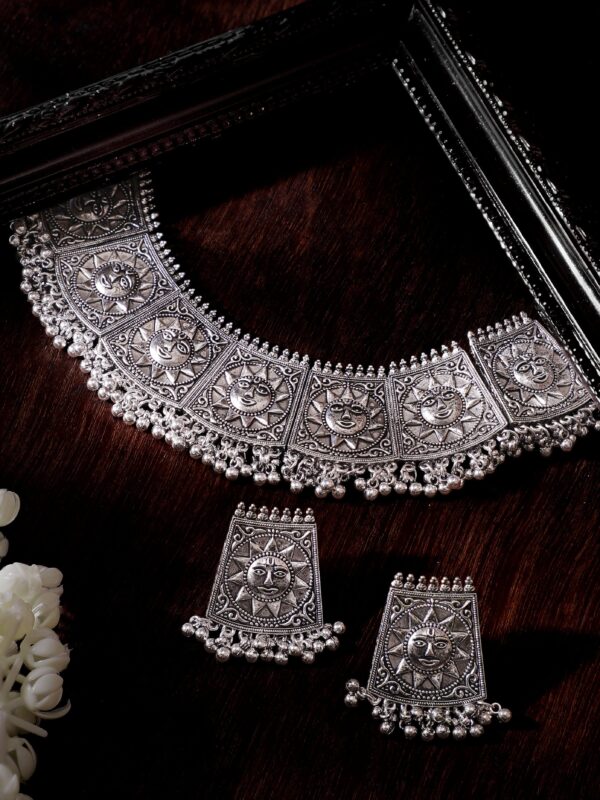 Elevate your style with this exquisite handcrafted statement necklace set. Crafted with silver oxidized accents and adorned with lustrous pearl beads, this set exudes elegance and charm. Make a lasting impression with this timeless accessory. Material & Care Dimension : Necklace : 18 cm Earrings : 3 cm Material : Alloy Care Label : It is advisable to avoid contact with water and organic chemicals i.e. perfume sprays. Store jewellery in airtight box. After use, wipe the jewellery with soft