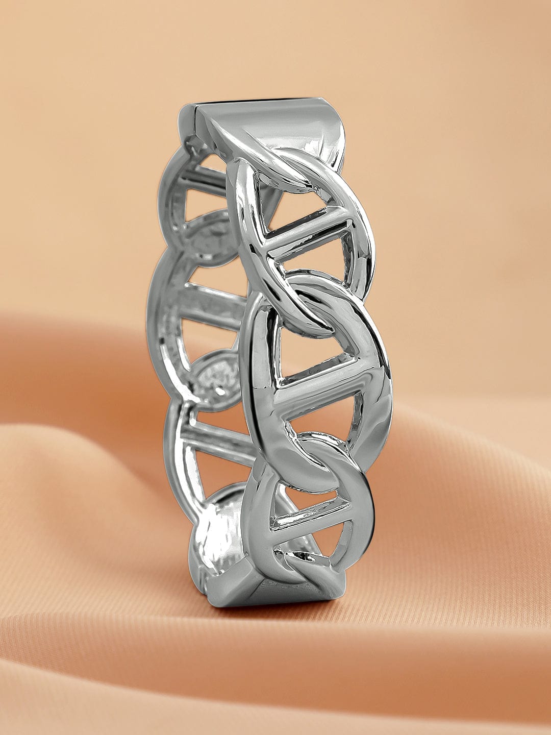 Bracelet : This rhodium-plated bangle-style bracelet in a sleek silver tone is crafted from stainless steel. Waterproof and tarnish-free, it adds a modern and elegant touch to any outfit. Occasion : Bring your style to a whole new level with this handcrafted piece of jewellery. When you’re celebrating a special Occasion : – a birthday, wedding, or personal milestone – this piece adds that extra something that makes us feel special and looking our best. Material : & Care Dimension : Size : Length : 2.4 cm Material :Brass Care Label : It is advisable to avoid contact with water and organic chemicals i.e. perfume sprays. Store jewellery in airtight box. After use, wipe the jewellery with soft cotton cloth.