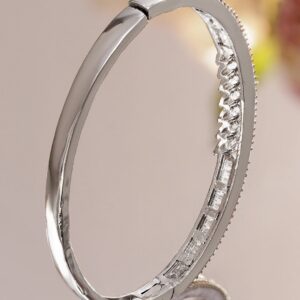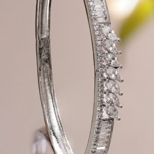 Bracelet – This rhodium-plated brass bracelet features a sleek linear design with marquise, baguette, and micro cubic zirconia stones—ideal for daily elegance, festive wear, or gifting occasions. Ideal Gifting Jewellery: A sophisticated gift for women & girls for Rakhi, birthdays, anniversaries or daily styling—versatile, timeless, and beautifully crafted in an elegant silhouette. Material : & Care Dimension : Length: 6.2cm ; Width: 0.5 cm Material: Brass Net Weight: 12 Gram Net Quantity: 1 Bracelet Type : Openable Bracelet Care Label: It is advisable to avoid contact with water and organic chemicals i.e. perfume sprays. Store jewellery in airtight box. After use, wipe the jewellery with soft cotton cloth.