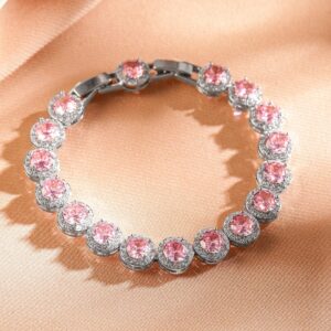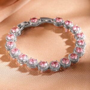Bracelet : Add a touch of feminine charm with this stunning pink round-cut tennis bracelet. Each beautifully faceted stone is set in a silver-tone frame, creating a radiant and sophisticated look. Whether worn alone or stacked with other pieces, this bracelet is perfect for both special occasions and everyday elegance. A timeless accessory that exudes grace and glamour! Occasion : Bring your style to a whole new level with this handcrafted piece of jewellery. When you’re celebrating a special Occasion : – a birthday, wedding, or personal milestone – this piece adds that extra something that makes us feel special and looking our best. Material : & Care Dimension : Length : 18.3 cm, Width: 0.4 cm Net Weight: 18.12 g Net Quantity : 1 Bracelet Material :Brass Care Label : It is advisable to avoid contact with water and organic chemicals i.e. perfume sprays. Store jewellery in airtight box. After use, wipe the jewellery with soft cotton cloth.