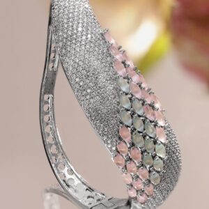 Bracelet : Crafted in high-quality brass, this rhodium-plated bracelet features pastel pink & green stones with fine cubic zirconia detailing—ideal for parties, weddings, or festive celebrations. Gifting-Ready Glam : A refined gift option for birthdays, Rakhi, anniversaries, or festive occasions—this bracelet offers a perfect balance of charm, color, and timeless design. Material : & Care Dimension : Width: 1.7 cm Net Weight: 20.98 Gram Net Quantity : 1 Bracelet Material : Brass Care Label : It is advisable to avoid contact with water and organic chemicals i.e. perfume sprays. Store jewellery in airtight box. After use, wipe the jewellery with soft cotton cloth.
