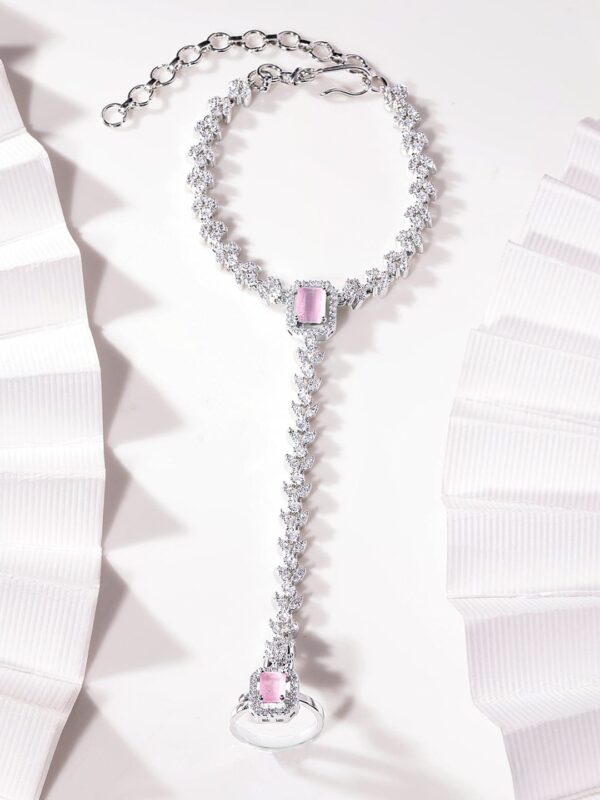 “Fashionable Brilliance: Rhodium-plated Hathphool (hand jewelry) adorned with shimmering Zirconia stones, adding a touch of glamour and sophistication to your ensemble.” Material & Care Length : Free Size Material: Brass Net Weight: 21.79 Gram Net Quantity: 1 Bracelet Care Label: It is advisable to avoid contact with water and organic chemicals i.e. perfume sprays. Store jewellery in airtight box. After use, wipe the jewellery with soft cotton cloth.