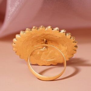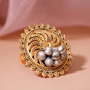 The oxidized gold plating adds an antique touch, enhancing the allure of the piece, while the ghungroo charms bring a playful and cultural element. Elevate your style with this unique statement ring that pays homage to tradition in a modern context. Material & Care Dimension : Free Size Material: Brass Net Weight: 12.81 Gram Net Quantity: 1 Ring Care Label: It is advisable to avoid contact with water and organic chemicals i.e. perfume sprays. Store jewellery in airtight box. After use, wipe the jewellery with soft cotton cloth.