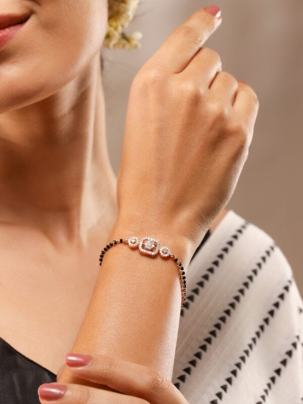 Bracelet : This rose gold-plated mangalsutra bracelet features dual strands of black beads and white cubic zirconia floral motifs—perfect for everyday elegance and traditional wear for married women. Occasion : Bring your style to a whole new level with this handcrafted piece of jewellery. When you’re celebrating a special Occasion : – a birthday, wedding, festive or personal milestone – this piece adds that extra something that makes us feel special and looking our best. Material : & Care Dimension : Length : 17 cm, Width : 1 cm Net Weight: 3.83 gram Net Quantity : 1 Bracelet Material :Brass Care Label : It is advisable to avoid contact with water and organic chemicals i.e. perfume sprays. Store jewellery in airtight box. After use, wipe the jewellery with soft cotton cloth.