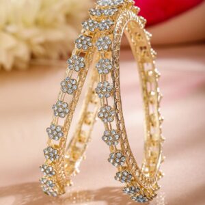 Bangles & Bracelet : This set of 2 handcrafted bangles features a stunning 18K gold-plated filigree design, adorned with brilliant white AD stones in floral motifs, offering grace and elegance for festive occasions. Occasion : Bring your style to a whole new level with this handcrafted piece of jewellery. When you’re celebrating a special Occasion : – a birthday, wedding, or personal milestone – this piece adds that extra something that makes us feel special and looking our best. Material : & Care Net Weight: 35 g Net Quantity : 2 Bangles Material :Brass Care Label : It is advisable to avoid contact with water and organic chemicals i.e. perfume sprays. Store jewellery in airtight box. After use, wipe the jewellery with soft cotton cloth.