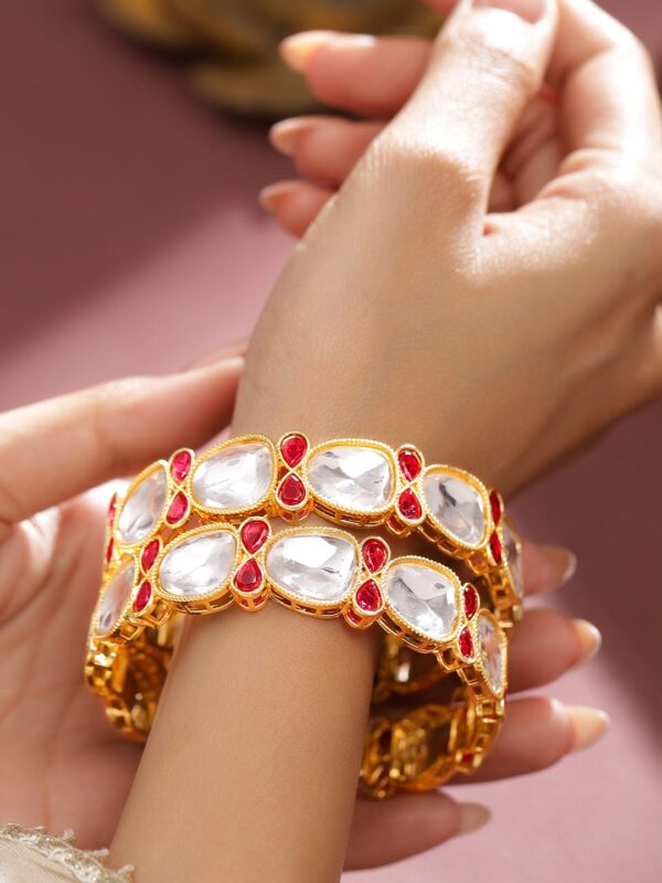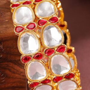 Bangle : Set of 2 bangles crafted in 18K gold-plated brass, featuring crystal white cubic zirconia and ruby red stones in a double-row floral setting—perfect for festive occasions and traditional ethnic wear. Occasion Styling: Ideal for festive celebrations, poojas, weddings, and traditional gatherings. These bangles pair beautifully with sarees, lehengas, and silk suits to complete a grand ethnic ensemble. Material : & Care Material : Brass Weight : 46.56 Gram Net Quantity : 2 Bangles Care Label : It is advisable to avoid contact with water and organic chemicals i.e. perfume sprays. Store jewellery in airtight box. After use, wipe the jewellery with soft cotton cloth.