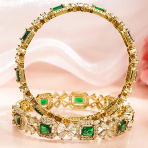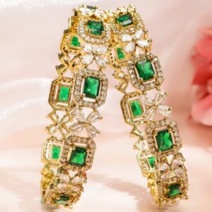 Bangle : These 18K gold-plated floral bangles are studded with emerald green and white cubic zirconia stones, adding a luxurious, festive charm to bridal and traditional ensembles. Perfect for Bridal & Festive Wear: Ideal for brides, bridesmaids, or festive dressing, these bangles elevate ethnic wear like sarees and lehengas with their bold and traditional flair. Material & Care Material: Brass Plating : Gold Plated Net Weight: 48 Gram Net Quantity: 2 Bangles Care Label : It is advisable to avoid contact with water and organic chemicals i.e. perfume sprays. Store jewellery in airtight box. After use, wipe the jewellery with soft cotton cloth.