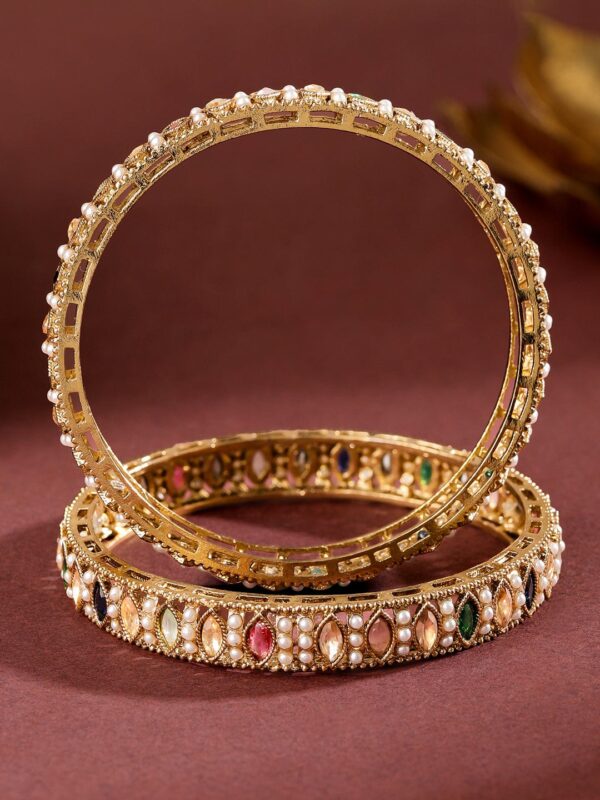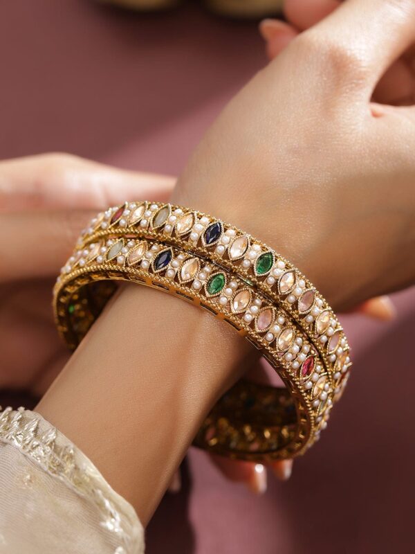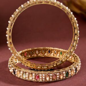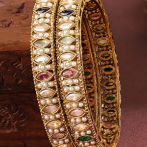 Bangle : This 18K gold-plated brass bangle set features mini pearls and multi-coloured marquise-cut stones in an intricate symmetrical pattern—perfect for festive, traditional, and ethnic styling. Occasion Styling: Ideal for festive poojas, karva chauth, haldi functions, and cultural events. These bangles pair well with embroidered sarees, lehengas, or traditional salwar suits for a timeless ethnic look. Material : & Care Plating: Gold Plated Material : Brass Net Weight: 41 Gram Net Quantity: 2 Bangles Care Label : It is advisable to avoid contact with water and organic chemicals i.e. perfume sprays. Store jewellery in airtight box. After use, wipe the jewellery with soft cotton cloth.