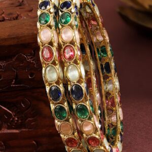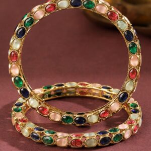 Bangle : This set of 2 18K gold-plated bangles features oval-cut stones in ruby pink, emerald green, blue sapphire, and pastel hues—crafted to enhance ethnic wear with vibrant and festive elegance. Occasion Styling: Ideal for festive poojas, karva chauth, haldi functions, and cultural events. These bangles pair well with embroidered sarees, lehengas, or traditional salwar suits for a timeless ethnic look. Material : & Care Plating: Gold Plated Material : Brass Net Weight: 42 Gram Net Quantity: 2 Bangles Care Label : It is advisable to avoid contact with water and organic chemicals i.e. perfume sprays. Store jewellery in airtight box. After use, wipe the jewellery with soft cotton cloth.