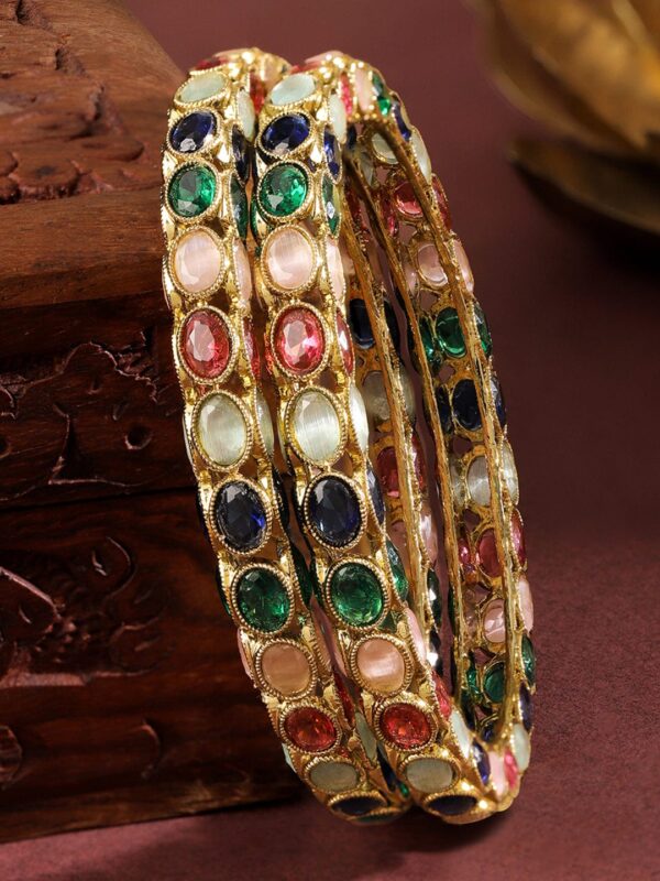 Set of 2 18K Gold-Plated Multi-Coloured Oval Stone Studded Designer Bangles – 2.8