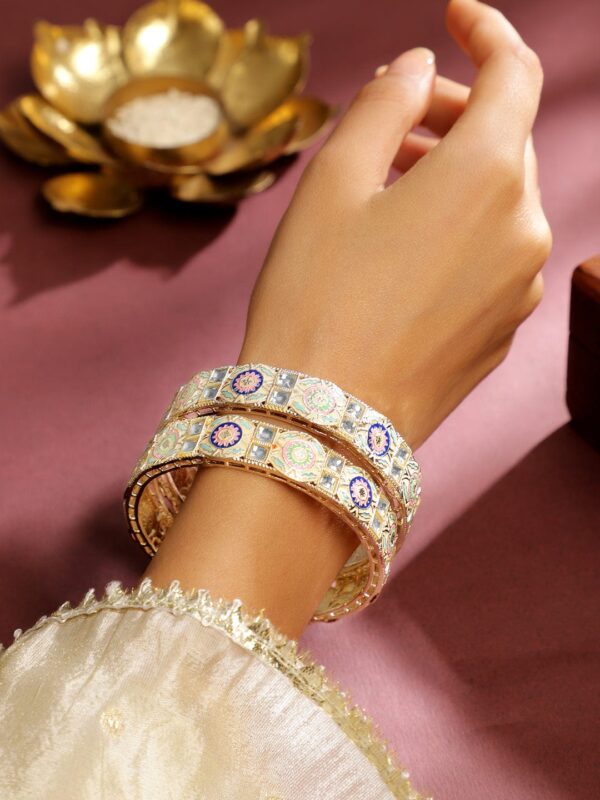 Experience regal charm with this set of 2 bangles, exquisitely designed with 18K gold plating, multicolor enamel work, and kundan stone embellishments. The traditional motifs and intricate craftsmanship add a majestic touch, making them ideal for weddings, festive occasions, and cultural celebrations. Occasion : Bring your style to a whole new level with this handcrafted piece of jewellery. When you’re celebrating a special Occasion : – a birthday, wedding, or personal milestone – this piece adds that extra something that makes us feel special and looking our best. Material : & Care Net Weight: 44.6 g Net Quantity : 2 Bangles Material :Brass Care Label : It is advisable to avoid contact with water and organic chemicals i.e. perfume sprays. Store jewellery in airtight box. After use, wipe the jewellery with soft cotton cloth.