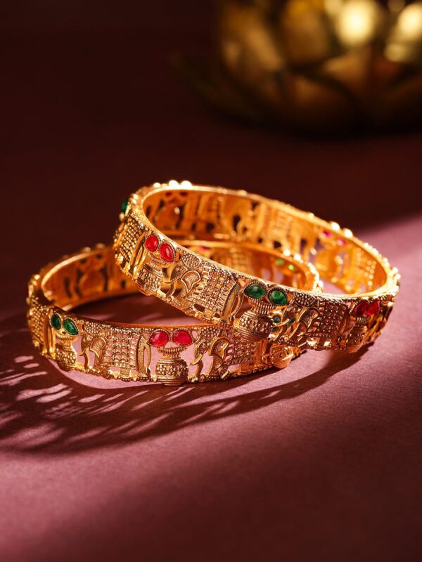 Bangles & Bracelet : This set of 2 18K gold-plated bangles features a Rajwadi polish finish with intricate elephant motifs and exquisite ruby red and emerald green stone detailing. The royal craftsmanship and filigree work add a regal touch, making it an opulent addition to traditional jewelry collections. Occasion : Bring your style to a whole new level with this handcrafted piece of jewellery. When you’re celebrating a special Occasion : – a birthday, wedding, or personal milestone – this piece adds that extra something that makes us feel special and looking our best. Material : & Care Net Quantity : 2 Bangles Net Weight: 41 g Material :Brass Care Label : It is advisable to avoid contact with water and organic chemicals i.e. perfume sprays. Store jewellery in airtight box. After use, wipe the jewellery with soft cotton cloth.