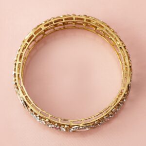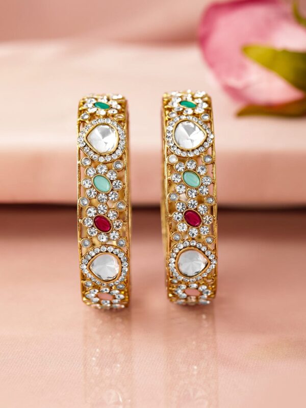 Bangle : Discover the elegance of Set of 2 18K Mehandi Gold-Plated Kundan & Cubic Zicronia Stone Bangles. This piece combines quality craftsmanship with a timeless design, making it perfect for any occasion. Elevate your style effortlessly and enjoy compliments on your refined taste. A must-have addition to your jewelry collection. Occasion : Bring your style to a whole new level with this handcrafted piece of jewellery. When you’re celebrating a special Occasion : – a birthday, wedding, or personal milestone – this piece adds that extra something that makes us feel special and looking our best. Material : & Care Material :Brass Weight : 65.71g Net Qnty : 2 Bangles Care Label : It is advisable to avoid contact with water and organic chemicals i.e. perfume sprays. Store jewellery in airtight box. After use, wipe the jewellery with soft cotton cloth.