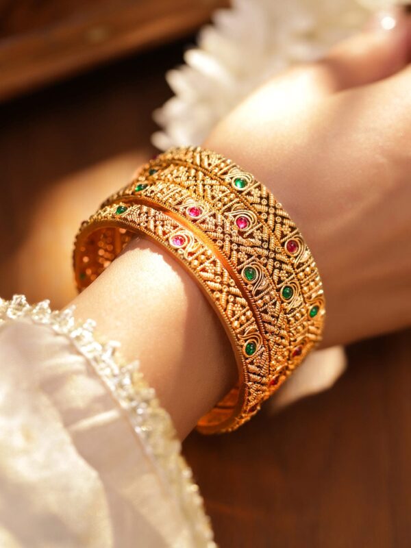 Bangle : This set of 2 antique bangles is crafted in high-quality brass, plated with 22K gold, and adorned with ruby red and emerald green stones – perfect for weddings, parties, and festive looks. Occasion-Perfect Design: A timeless accessory for weddings, Diwali, Navratri, pujas, and family celebrations—these bangles add grandeur to sarees, lehengas, or salwar suits with ease. Material : & Care Material: Brass Net Weight: 64.32 Gram Net Quantity: 2 Bangles Care Label : It is advisable to avoid contact with water and organic chemicals i.e. perfume sprays. Store jewellery in airtight box. After use, wipe the jewellery with soft cotton cloth.