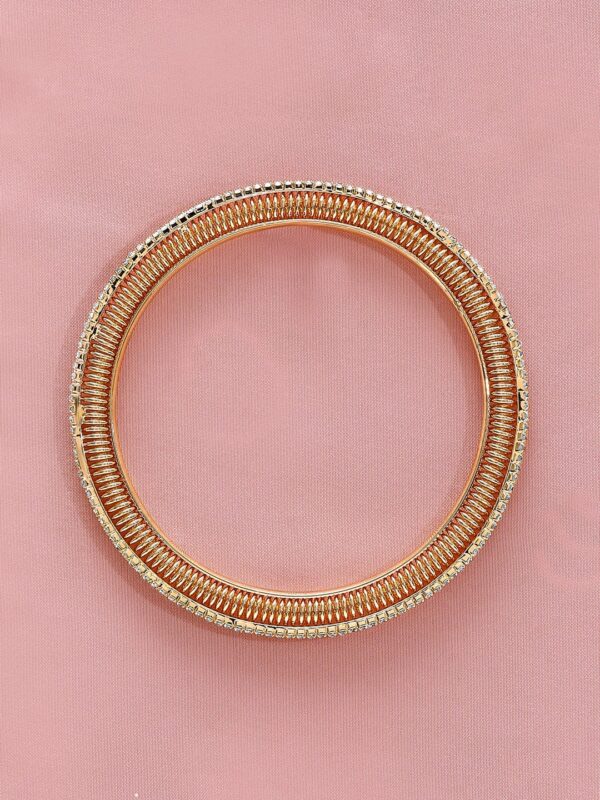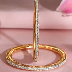 Bangle : This set of 2 bangles features a 22K gold-plated finish with sparkling cubic zirconia, offering a luxurious and radiant look. Perfect for elevating traditional and modern outfits. Occasion : Bring your style to a whole new level with this handcrafted piece of jewellery. When you’re celebrating a special Occasion : – a birthday, wedding, or personal milestone – this piece adds that extra something that makes us feel special and looking our best. Material : & Care Dimension : Net Weight: 48.30 g Net Quantity: 2 Bangles Material :Brass Care Label : It is advisable to avoid contact with water and organic chemicals i.e. perfume sprays. Store jewellery in airtight box. After use, wipe the jewellery with soft cotton cloth.