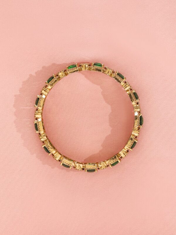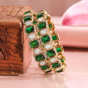 Bangle : Discover elegance with the Gold-Plated design, meticulously crafted for those who cherish luxury. This piece features Ruby and Emerald stones for an eye-catching sparkle, making it perfect for special occasions. With a blend of high-quality materials and exquisite design, it promises both durability and style. The versatile look can complement a variety of outfits, adding a touch of sophistication. A must-have for enhancing your accessory collection with timeless elegance. Occasion : Bring your style to a whole new level with this handcrafted piece of jewellery. When you’re celebrating a special Occasion : – a birthday, wedding, or personal milestone – this piece adds that extra something that makes us feel special and looking our best. Material : & Care Dimension : Length : 2.6 size, Width: 2.6 size Material :Brass Care Label : It is advisable to avoid contact with water and organic chemicals i.e. perfume sprays. Store jewellery in airtight box. After use, wipe the jewellery with soft cotton cloth.