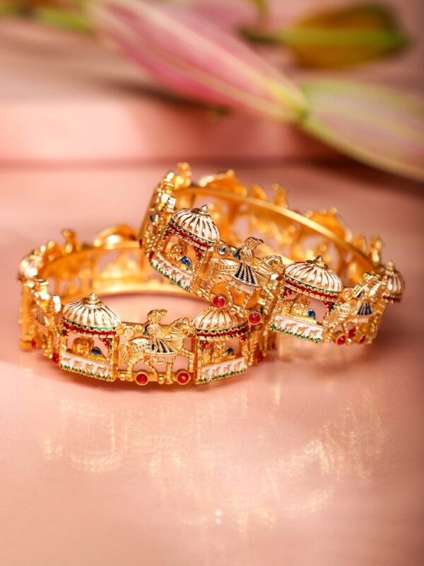 Bangles & Bracelet : These 22K gold-plated handcrafted bridal bangles showcase an ornate procession motif with intricate multicolor enamel work, red and green stone accents, and miniature detailing, making them a perfect heritage piece for weddings and festive occasions. Occasion : Bring your style to a whole new level with this handcrafted piece of jewellery. When you’re celebrating a special Occasion : – a birthday, wedding, or personal milestone – this piece adds that extra something that makes us feel special and looking our best. Material : & Care Net Quantity : 2 Bangles Net Weight: 92.18 g Material :Brass Care Label : It is advisable to avoid contact with water and organic chemicals i.e. perfume sprays. Store jewellery in airtight box. After use, wipe the jewellery with soft cotton cloth.