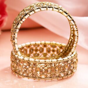 A stunning set of 2, 22K gold-plated bangles, beautifully handcrafted with Kundan & Cubic Zirconia stones and intricate pearl beading, perfect for adding a traditional touch to your ensemble. Material & Care Material : Brass Net Weight: 8 Gram Net Quantity: 2 Bangles Care Label : It is advisable to avoid contact with water and organic chemicals i.e. perfume sprays. Store jewellery in airtight box. After use, wipe the jewellery with soft cotton cloth.