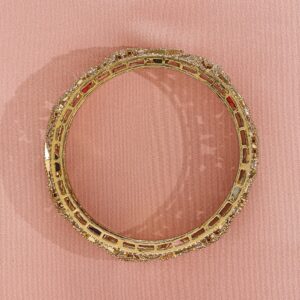 Bangle : These 22K gold-plated bangles are beautifully adorned with multicolored AD and cubic zirconia stones, offering a vibrant and elegant appeal. Perfect for adding a touch of tradition to your jewelry collection. Occasion : Bring your style to a whole new level with this handcrafted piece of jewellery. When you’re celebrating a special Occasion : – a birthday, wedding, or personal milestone – this piece adds that extra something that makes us feel special and looking our best. Material : & Care Dimension : Net Weight: 77,53 g Net Quantity: 2 Bangles Material :Brass Care Label : It is advisable to avoid contact with water and organic chemicals i.e. perfume sprays. Store jewellery in airtight box. After use, wipe the jewellery with soft cotton cloth.