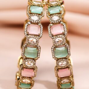 Be the first to review “Set of 2 22K Gold-Plated Pastel Pink, Mint Green & White Cubic Zirconia Studded Premium Bangles – 2.4”