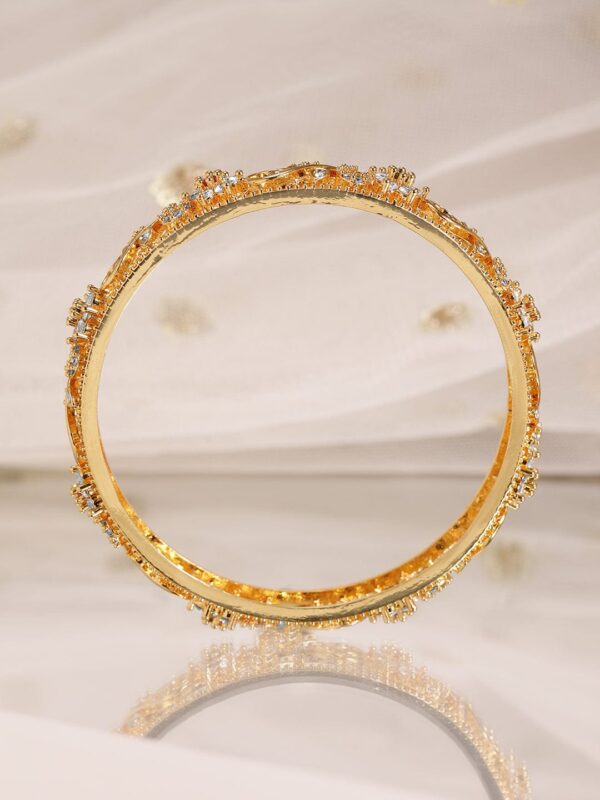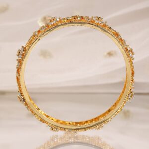 Set of 2 handcrafted 22K gold-plated bangles featuring ruby, emerald, and cubic zirconia stones. Designed with intricate floral patterns, perfect for adding elegance to festive or bridal looks. Material: Brass Plating : Gold Plated Net Weight: 44 Gram Net Quantity: 2 Bangles Care Label: It is advisable to avoid contact with water and organic chemicals i.e. perfume sprays. Store jewellery in airtight box. After use, wipe the jewellery with soft cotton cloth.