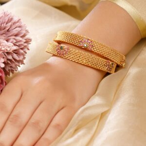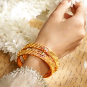 Adorn your wrist with finest handcrafted gold plated bangles studded with color stones. Pair it up and flaunt with your ethnic attire. Occasion : Bring your style to a whole new level with this handcrafted piece of jewellery. When you’re celebrating a special Occasion : – a birthday, wedding, or personal milestone – this piece adds that extra something that makes us feel special and looking our best. Material : & Care Dimension : Material: Brass Net Weight: 30 Gram Net Quantity: 2 Bangles Care Label : It is advisable to avoid contact with water and organic chemicals i.e. perfume sprays. Store jewellery in airtight box