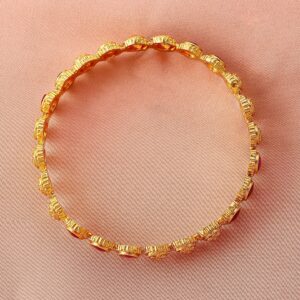 These exquisite 22K gold-plated bangles by are a timeless addition to your jewelry collection. Featuring intricate floral filigree craftsmanship, the bangles are beautifully adorned with ruby-colored accents, adding a regal charm to the design. Their delicate detailing and luxurious finish make them perfect for weddings, festive occasions, or special celebrations. Occasion : Bring your style to a whole new level with this handcrafted piece of jewellery. When you’re celebrating a special Occasion : – a birthday, wedding, or personal milestone – this piece adds that extra something that makes us feel special and looking our best. Material & Care Material: Brass Net Weight: 47 Gram Net Quantity: 2 Bangles Care Label: It is advisable to avoid contact with water and organic chemicals i.e. perfume sprays. Store jewellery in airtight box. After use, wipe the jewellery with soft cotton cloth.