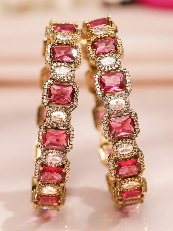 Bangle : This set of 2 22K gold-plated bangles features rectangular ruby pink stones and oval white cubic zirconia, bordered with fine detailing. A rich and regal accessory for women & girls for festive and wedding wear. Occasion : Bring your style to a whole new level with this handcrafted piece of jewellery. When you’re celebrating a special Occasion : – a birthday, wedding, festive or personal milestone – this piece adds that extra something that makes us feel special and looking our best. Material : & Care Plating: Gold Plated Material :Brass Net Weight: 62 Gram Net Quantity: 2 Bangles Care Label : It is advisable to avoid contact with water and organic chemicals i.e. perfume sprays. Store jewellery in airtight box. After use, wipe the jewellery with soft cotton cloth.