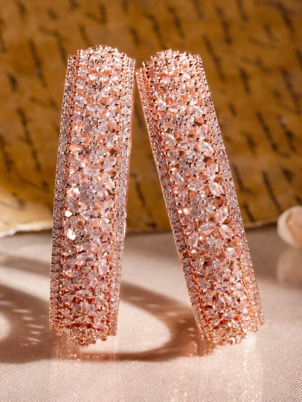 Adorn your wrist with finest handcrafted 22K rose gold plated bangles . Pair it up and flaunt with your ethnic attire. Occasion : Bring your style to a whole new level with this handcrafted piece of jewellery. When you’re celebrating a special Occasion : – a birthday, wedding, festive or personal milestone – this piece adds that extra something that makes us feel special and looking our best. Material & Care Material: Brass Net Weight: 71.69 Gram Net Quantity: 2 Bangles Care Label: It is advisable to avoid contact with water and organic chemicals i.e. perfume sprays. Store jewellery in airtight box. After use, wipe the jewellery with soft cotton cloth.