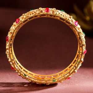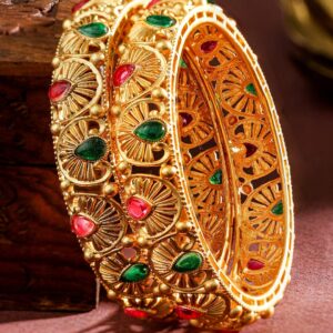 Adorn your wrists with these 24K gold-plated handcrafted bangles, featuring intricate filigree work with ruby red & emerald green teardrop stones, perfect for weddings & festive occasions. Occasion : Bring your style to a whole new level with this handcrafted piece of jewellery. When you’re celebrating a special Occasion : – a birthday, wedding, or personal milestone – this piece adds that extra something that makes us feel special and looking our best. Material : & Care Material: Brass Net Weight: 43.66 Gram Net Quantity: 2 Bangles Care Label : It is advisable to avoid contact with water and organic chemicals i.e. perfume sprays. Store jewellery in airtight box. After use, wipe the jewellery with soft cotton cloth.